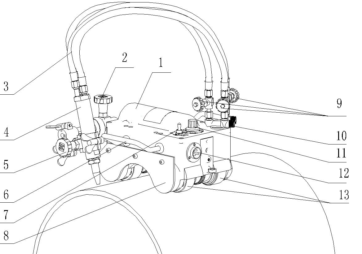 1.主體部件 2.橫向進給手輪:可調(diào)節(jié)割炬水平位置 3.輸送氣體的軟管: 在氣體分配器和割炬之間 連接,三條氣管分別用于燃氣;預(yù)熱氧;切 割氧。 4.割炬 5.割炬調(diào)節(jié)手輪 6.把手 7.倒順開關(guān): 改變機器的運行方向,中間為停止位置 8.隔熱板 :阻礙因切割所產(chǎn)生的熱量向機器內(nèi)部擴散 9.二通閥: 調(diào)節(jié)氣體流量的大小。 10.氣體分配器: 11.速度控制旋扭: 沿“10”方向旋轉(zhuǎn)該鈕可使裝置移動加快, 沿“0”方向則使移動減。 12.連接線插座 13.磁滾輪: 兩組磁性滾輪可使機器沿管壁平穩(wěn)爬行