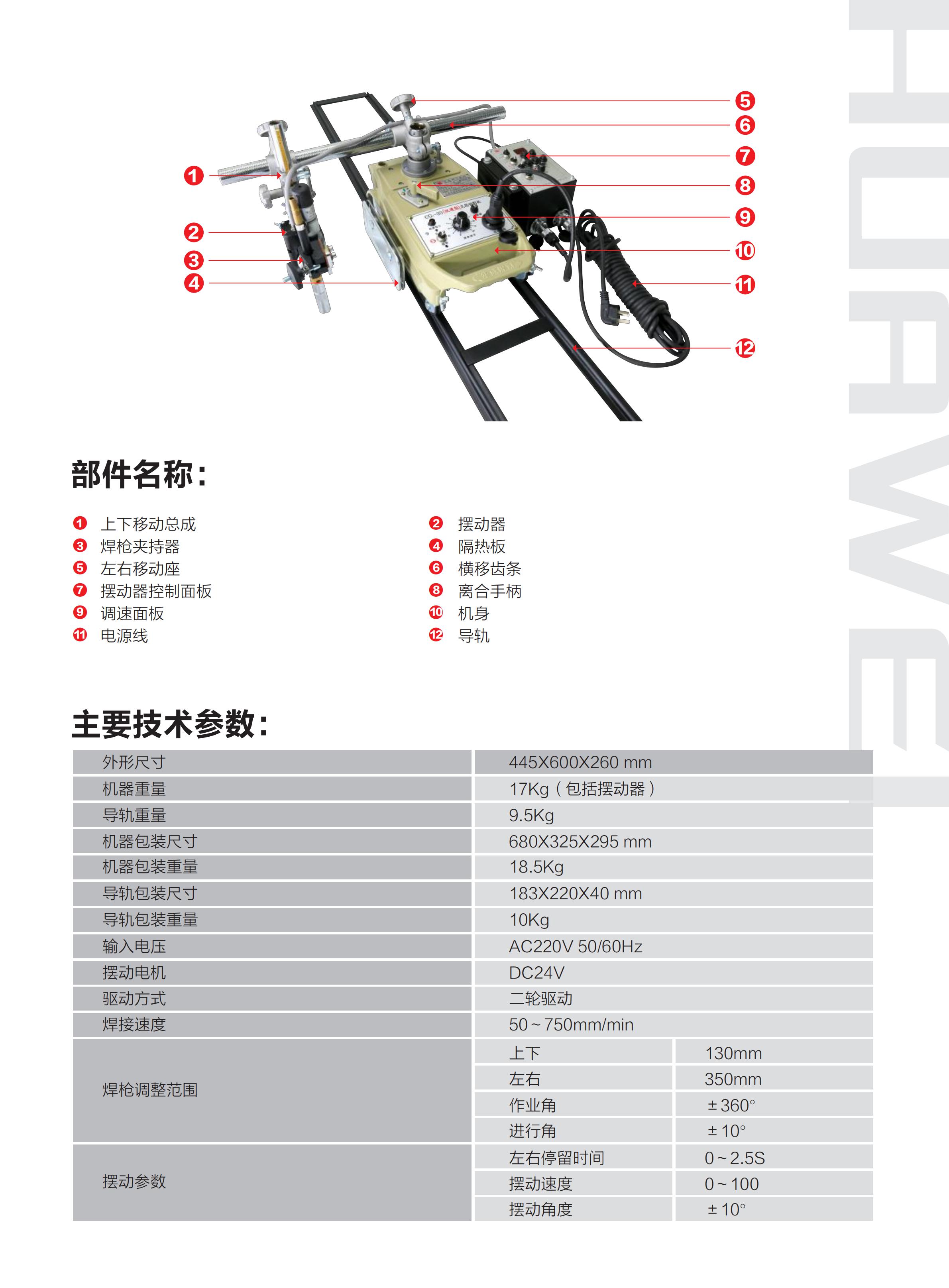 CG1-30-S擺動式自動焊接小車采用高強度鋁錠材料,精密壓鑄制作,結(jié)構(gòu)設(shè)計合理,行走穩(wěn)定性好。本小車在標(biāo)準(zhǔn)速度運行時,配合焊接控制盒和焊接擺動器可進行自動擺動焊接工作;也可裝置火焰切割割炬進行切割加工。
