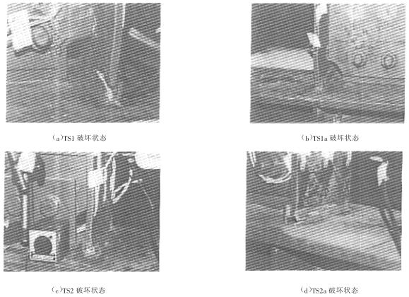 試驗時,首先沿使梁的上翼緣受拉的方向施加水平荷載, 然后反復加載。試件 TSl 由于平面外約束不足,在彈性加載階段就出現了扭轉, 節點板域有輕微屈服發生。塑性階段,焊接孔末端梁腹板與翼緣相接處上翼緣被腹板抵壓開裂。剪切板出現滑移, 破壞時下翼緣幾乎全部裂開, 加載點平面外位移約 5cm。TSla 在塑性階段,腹板受壓側觀察到局部屈曲,梁端加載點平面外位移最大達7cm, 剪切板附加焊縫受拉側明顯開裂。最后受拉側翼緣焊縫突然破壞, 荷載迅速下降, 梁下翼緣部分拉斷,同時上翼緣被壓屈。