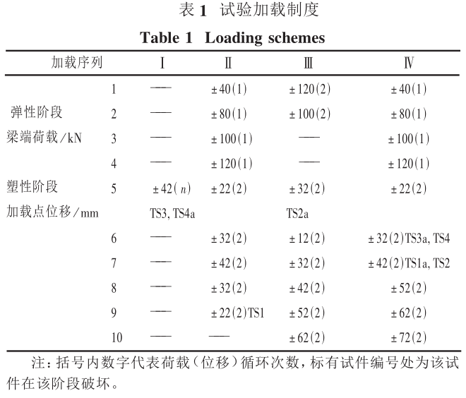 根據有限元分析,試件的彈性極限荷載約為120kN。加載分兩個階段,彈性階段最大荷載為120kN, 采用荷載增量控制, 出現塑性屈服后采用位移增量控制。為了研究加載次序對試件承載性能的影響, 試驗過程中采用了 4 種不同加載序列 (表 1 ) 。 其中加載序列 I 為直接在 42mm 位移幅度下加載至試件破壞。 試件 TS3 和 TS4a 采用加載序列 I, TS1 采用加載序列 II, TS2a 采用加載序列 III, TS1a、 TS2、 TS3a 和 TS4采用加載序列 IV。實際上在試驗中, 當梁端水平荷載加至 120kN 時已經觀察到局部漆皮起皺,即已發生局部的材料屈服。